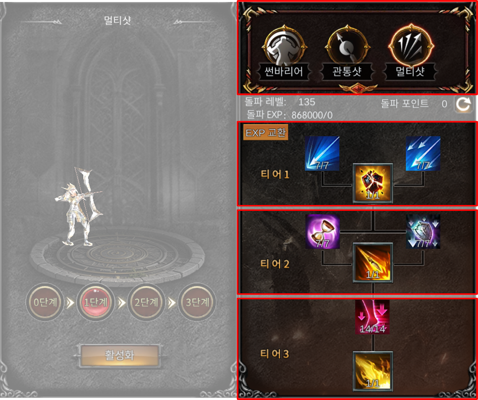 2단계(티어)는 Lv7까지 돌파 가능한 스킬 2개와 1개의 메인 돌파 스킬