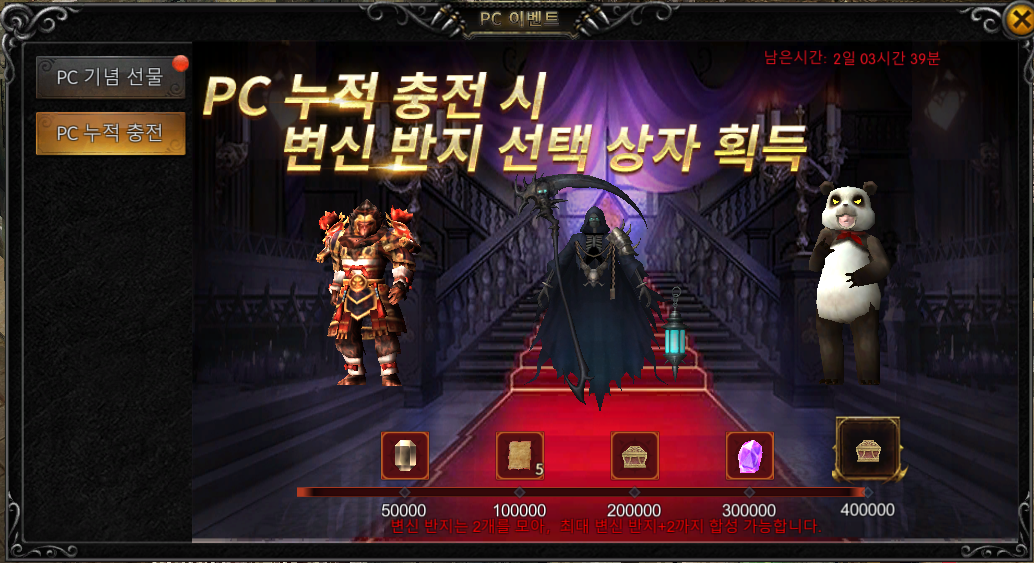 - 이벤트 기간 내 PC 버전에서 특정 누적 충전 금액 달성 시마다 보상을 획득할 수 있습니다.