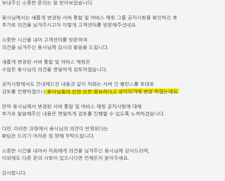 통합 이전으로 돌리던가 제대로 짝짝꿍하던가 순번대로 하는게 맞냐 이게 다 유저들 대답이다 핵과는 어차피 접음
