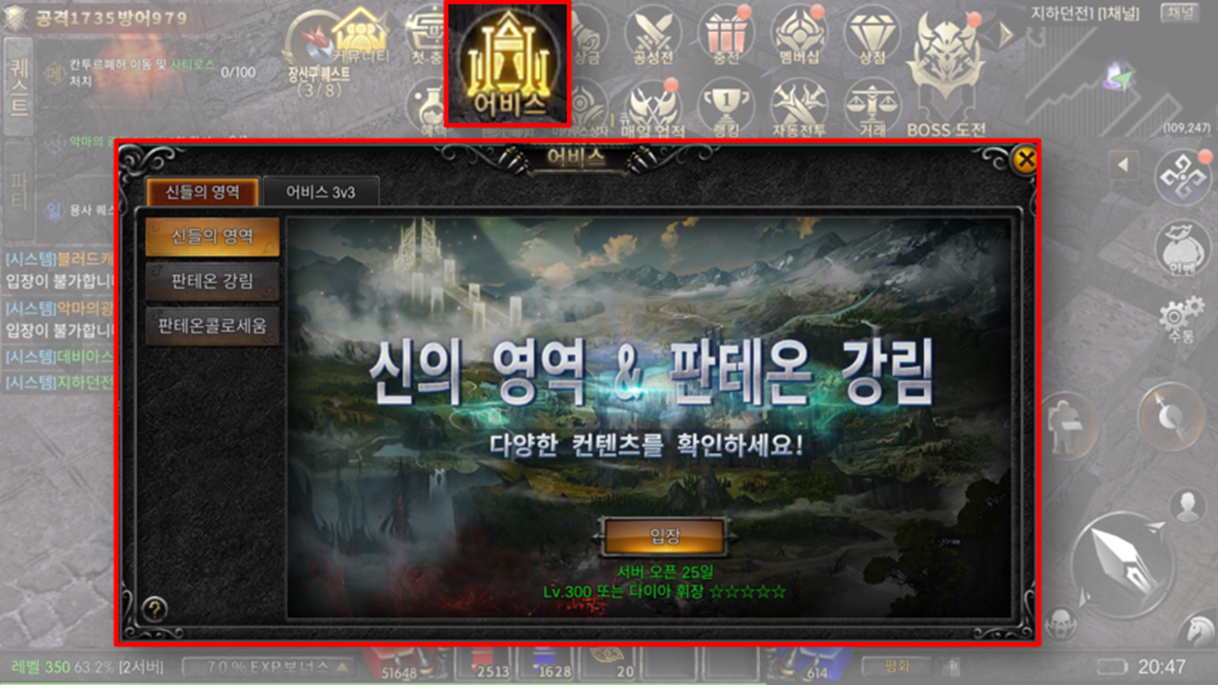 서버 오픈 25일차 이후, 그리고 캐릭터 300레벨 혹은 다이아 휘장 달성 시 어비스 콘텐츠를 이용할 수 있습니다.